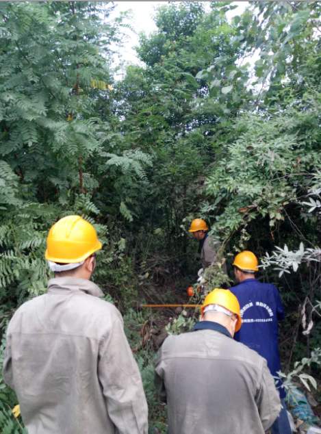 加壓站負責維護供電線路總長為16公里,且大多穿越山林,夏季樹木長勢格外迅猛,掃林任務顯得更加繁重。在密閉的樹林里異常悶熱,到處都是蚊蟲樹刺,巡線人員早上7點之前就早早出發(fā),戴著安全帽穿著厚厚的工作服,,頂著火辣辣的太陽,流血流汗,消滅影響供電安全的每一處樹障。(圖為工作人員正在砍伐樹障)