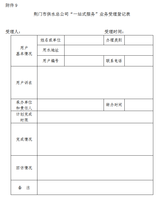 9.《荊門市供水總公司“一站式服務”業(yè)務受理登記表》