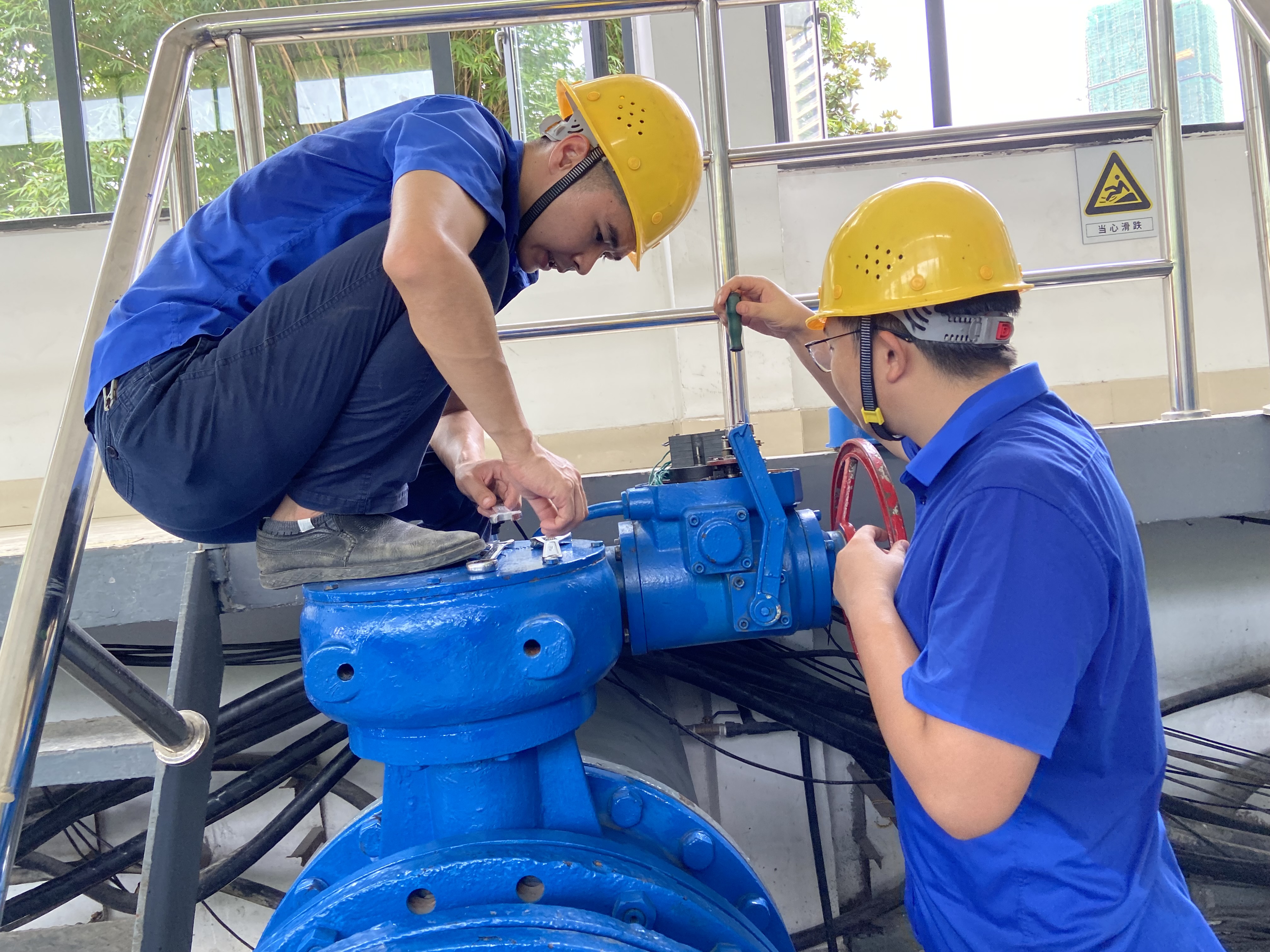 7月16日上午9:00,巡視人員發(fā)現(xiàn)中壓泵房1#機組閥門無法正常開啟,經(jīng)檢查,發(fā)現(xiàn)閥門控制系統(tǒng)故障,行程過力矩,導致執(zhí)行器外殼破裂,固定軸承損壞。相關人員立即上報站長。了解情況后,站長當機立斷,立即部署安排搶修工作。維修人員全員出動,與時間賽跑,焊接執(zhí)行器外殼、更換軸承及閥門、較準行程,在40℃高溫下歷時近十小時,工作服反復濕透多遍,終于趕在當晚19:00完成了任務,最大程度減少了對用戶生活帶來的不便。