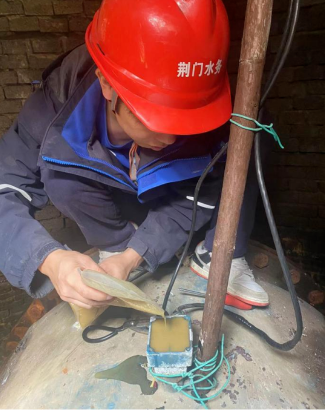 廠領(lǐng)導(dǎo)在綜合評(píng)估后,同意其思路,并作安全操作提醒。雖早有心理準(zhǔn)備,但在打開接線盒后的瞬間,李為龍等人還是倒吸一口涼氣。他們發(fā)現(xiàn)整個(gè)接線盒內(nèi)部被深色不透明的膠體充滿,無法掌握線路走向。短暫思索后,他們發(fā)揮水務(wù)人不怕苦、能戰(zhàn)斗的精神,嘗試按廠家給出建議,用熱風(fēng)槍加熱密封膠,但事與愿違,效果并不理想,密封膠沒有自動(dòng)融化流出。李為龍“改巧為笨”,在加熱的同時(shí)用小刀清理變軟的膠體。該處操作空間狹小,且不能損壞內(nèi)部的線路和接線端子,必須凝神聚力,是個(gè)“精細(xì)活”“體力活”。即便同事們輪番上陣,依然個(gè)個(gè)汗如雨下。功夫不負(fù)有心人,眾人合力熬過“漫長的”4小時(shí),最終完成了既定任務(wù)。