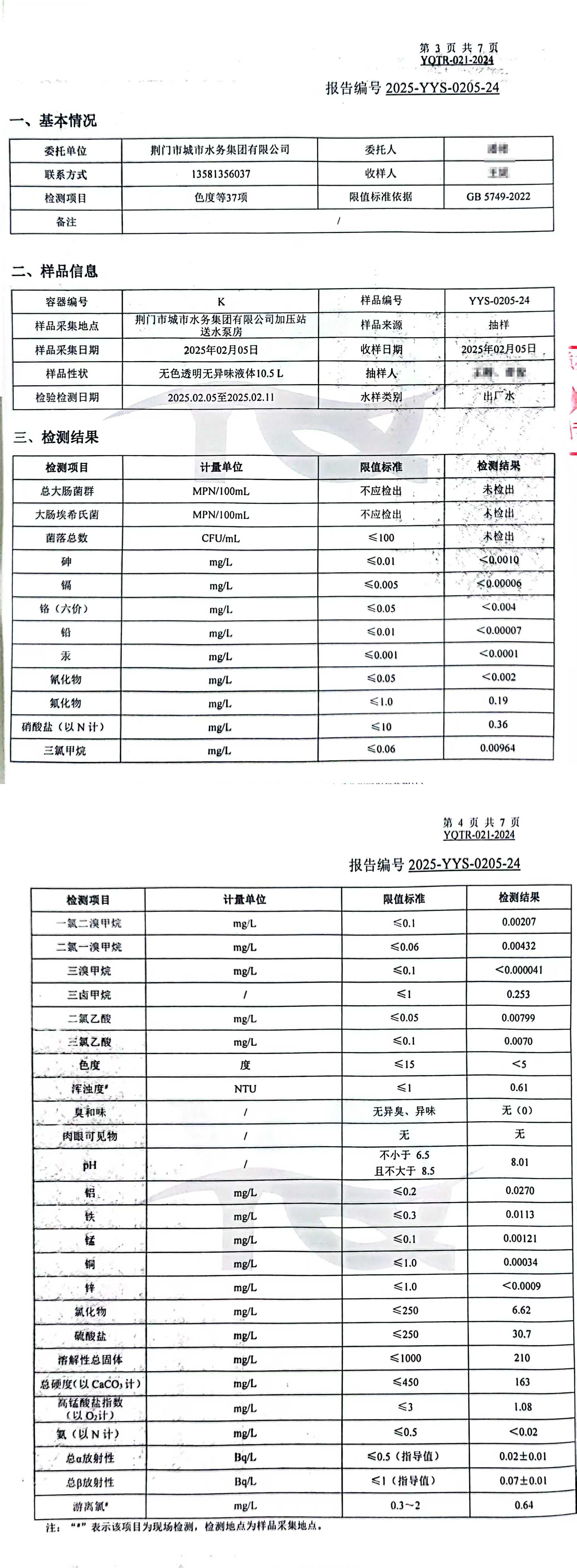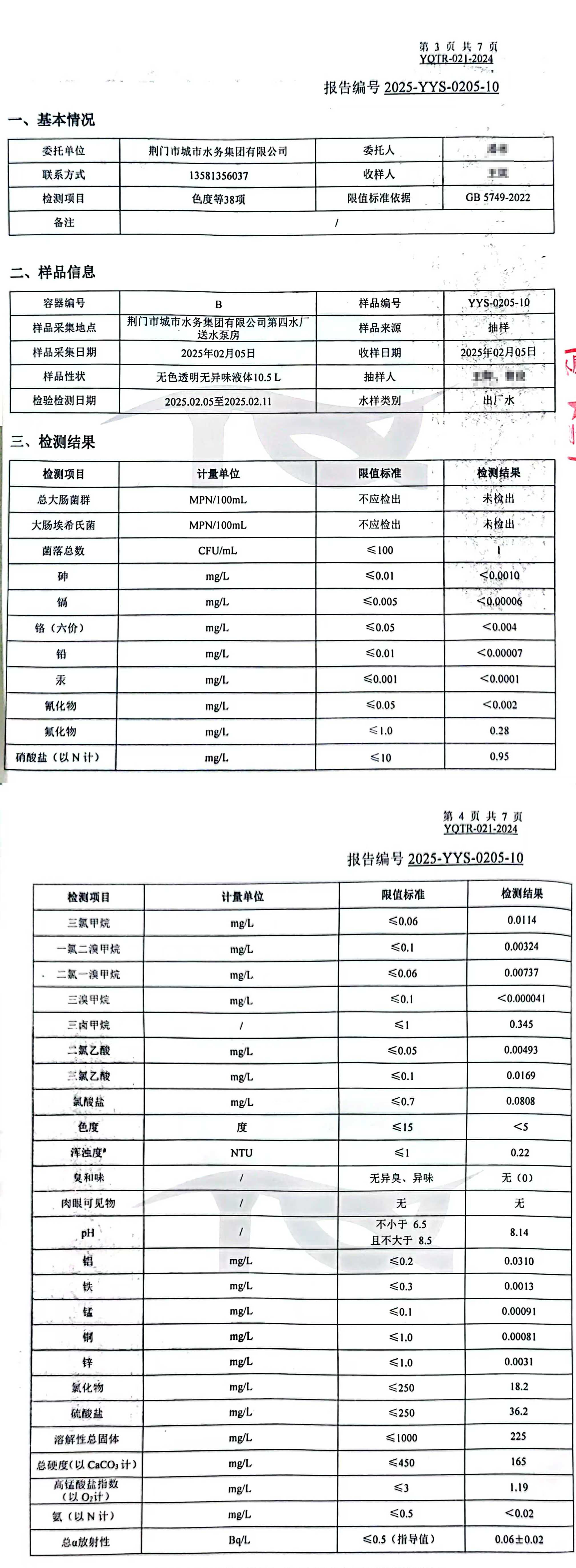 2025年2月,集團(tuán)委托具有CMA認(rèn)證資質(zhì)的第三方檢測(cè)機(jī)構(gòu),依據(jù)《生活飲用水衛(wèi)生標(biāo)準(zhǔn)》(GB5749-2022)對(duì)“四廠一站”出廠水、管網(wǎng)末梢水進(jìn)行全分析檢測(cè),水質(zhì)合格率100%。依據(jù)《地表水環(huán)境質(zhì)量標(biāo)準(zhǔn)(GB3838-2022)》檢測(cè)漳河原水,檢測(cè)結(jié)果為符合Ⅱ類(lèi)標(biāo)準(zhǔn)。