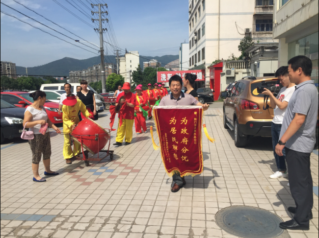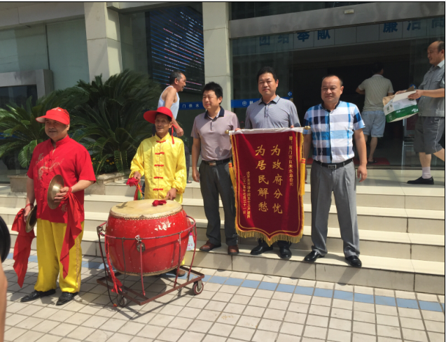 7月31日,虎牙關社區(qū)和用戶代表組織腰鼓隊到總公司送錦旗致謝。據悉,掇刀城南新區(qū)金苑大市場主、分水管網嚴重老化,水管破損而致停水。市供水總公司客服部門快速勘測報裝,維修處迅速組織施工,并調派應急供水車在改造期間為商戶送水。