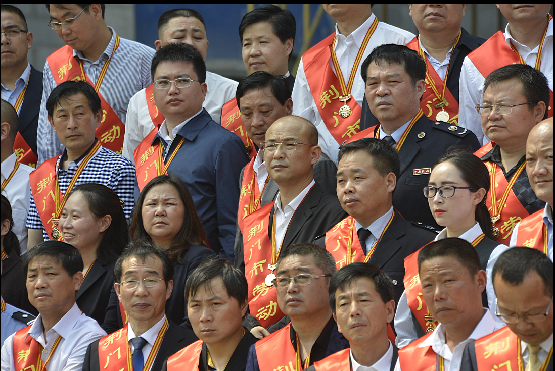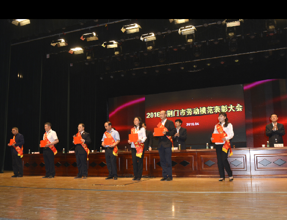荊門市勞動(dòng)模范、供水總公司黨委書記、總經(jīng)理陳永根(右二)上臺(tái)接受頒獎(jiǎng)。