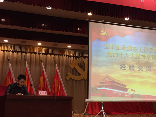 12月11日至12日,由市委組織部、市國資委聯(lián)合舉辦的全市企業(yè)黨務(wù)工作者學(xué)習(xí)黨的十九大精神培訓(xùn)會在荊門賓館召開。會上,四家企業(yè)進(jìn)行黨建經(jīng)驗(yàn)交流,市供水總公司黨委副書記、紀(jì)委書記徐黎明就加強(qiáng)企業(yè)基層黨建工作作交流發(fā)言。