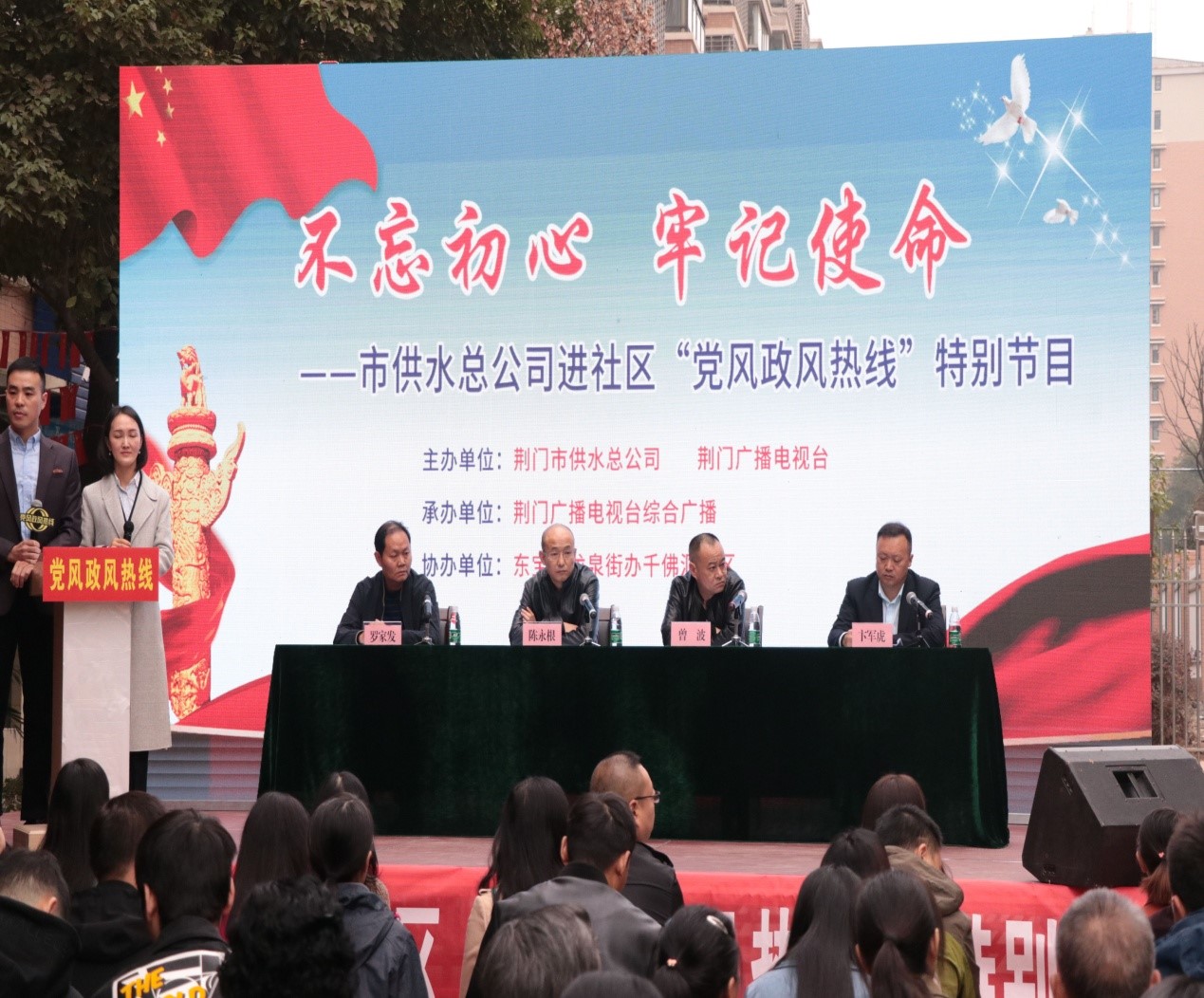 11月 6日上午,由荊門市供水總公司和荊門廣播電視臺聯(lián)合舉辦的“荊門供水進(jìn)社區(qū)‘黨風(fēng)政風(fēng)熱線’特別節(jié)目”在荊門千佛洞社區(qū)舉行。市供水總公司黨委書記、總經(jīng)理陳永根帶領(lǐng)領(lǐng)導(dǎo)班子相關(guān)成員參加節(jié)目現(xiàn)場(網(wǎng)絡(luò))直播,圍繞“不忘初心、牢記使命”主題教育,傾聽民情民意,接受現(xiàn)場問政,回應(yīng)百姓訴求,解決用戶難題。